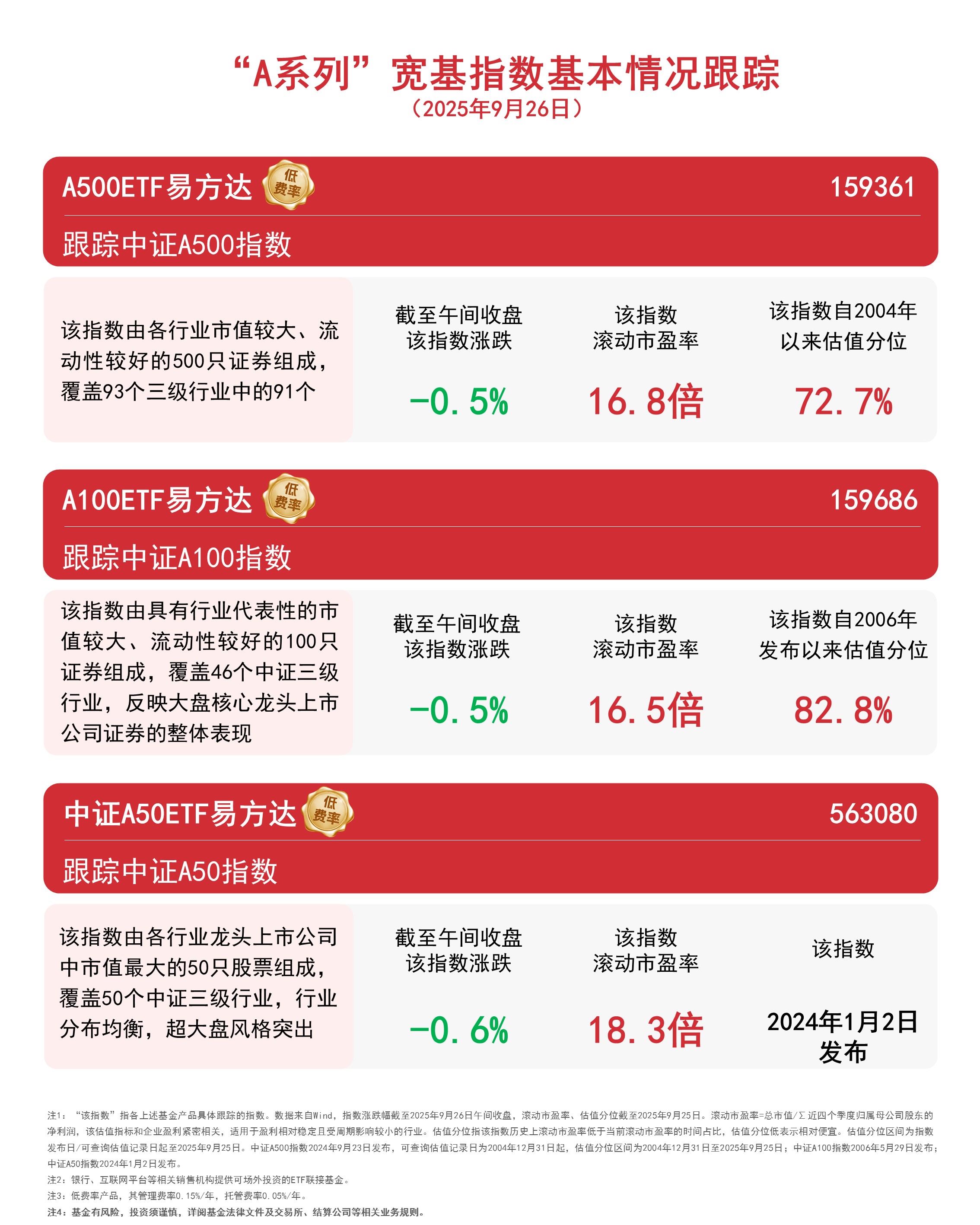 截至午間收盤,中證A500指數(shù)、中證A100指數(shù)均下跌0.5%,中證A50指數(shù)下跌0.6%,A500ETF易方達(159361)半日成交額超24億元,凈申購近4億份。