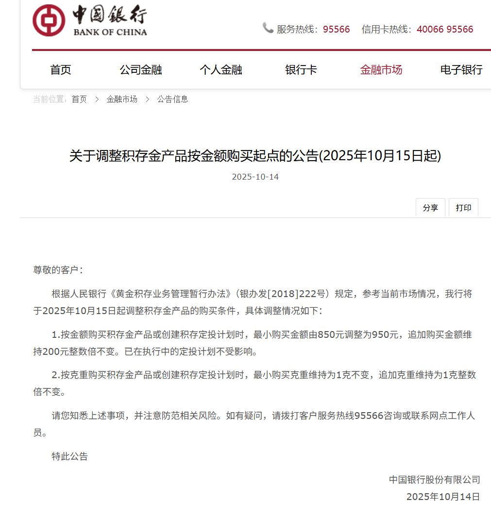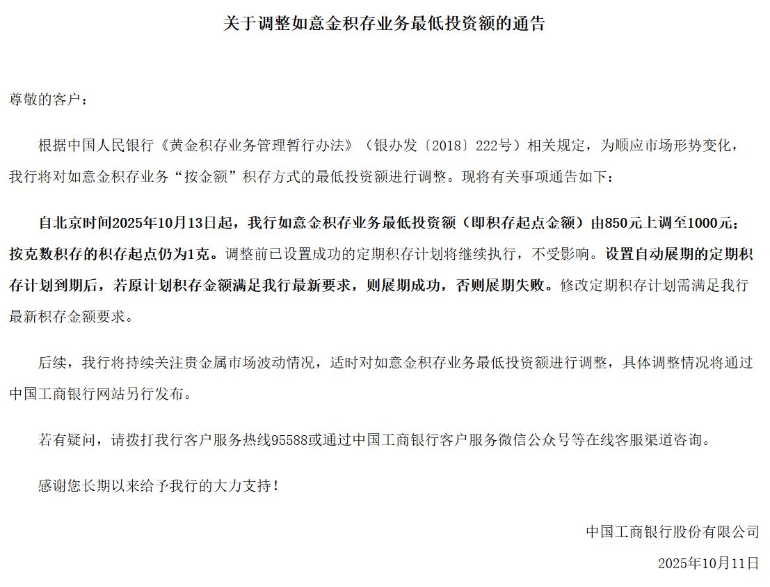 此前10月11日,工商銀行網(wǎng)站發(fā)布通告,為順應(yīng)市場(chǎng)形勢(shì)變化,我行將對(duì)如意金積存業(yè)務(wù)“按金額”積存方式的最低投資額進(jìn)行調(diào)整:自北京時(shí)間2025年10月13日起,該行如意金積存業(yè)務(wù)最低投資額(即積存起點(diǎn)金額)由850元上調(diào)至1000元;按克數(shù)積存的積存起點(diǎn)仍為1克。